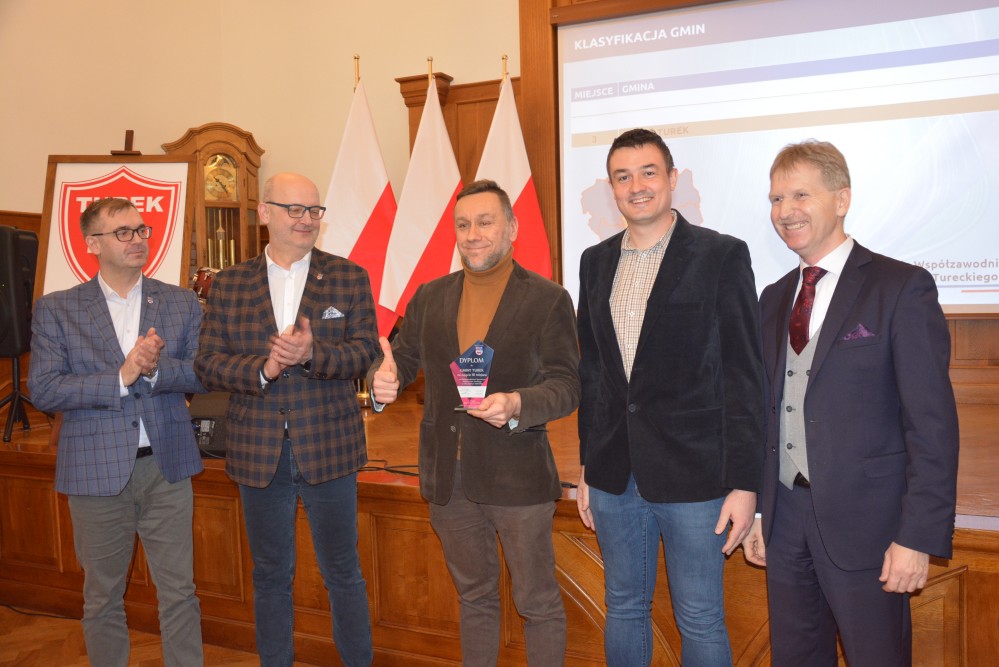 Przedstawiciele Gminy Turek: Pan Michał Mękarski, kierownik Referatu Oświaty, Kultury i Zdrowia oraz Pan Michał Kocik, radny Gminy Turek, z rąk Starosty Powiatu Tureckiego - Pana Dariusza Kałużnego, odebrali nagrodę dla Gminy Turek za III miejsce w klasyfikacji gmin powiatu tureckiego.