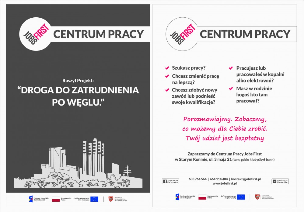 Poniżej kilka linków do informacji medialnych, które ukazały się w związku z uroczystym otwarciem Centrum Pracy Jobs First w Koninie 23 marca 2024 r. oraz plakaty informacyjne o projekcie